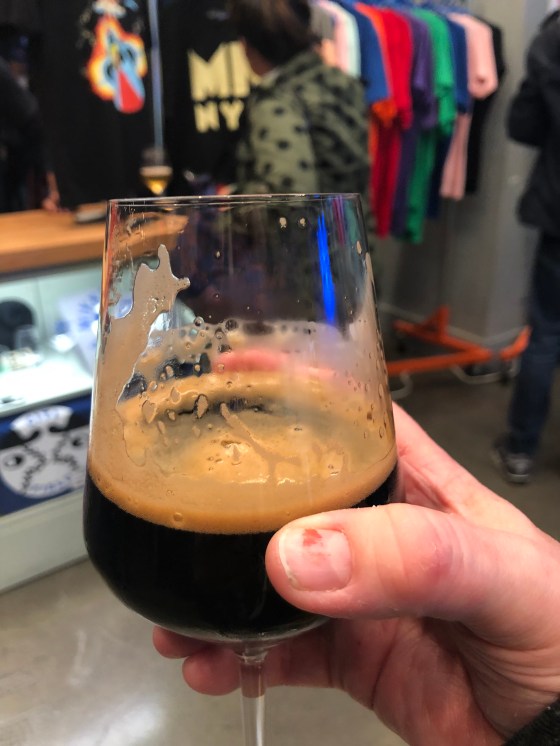 Since I’m something of a regular in the LIC brewery scene I was recognized by one of the bartenders. Hence the salute mentioned above. This location is much bigger than the Queens location which means room for more people, more barrels and more pups. Kelly thanked me for coming, but as a dedicated beer blogger I had to come. I asked if the live music was going to be a regular event and was told they are trying to get something going. They really should after all, someone built a stage! There is merchandise, including but not limited to a hoodie just like the one I was wearing except it had Brooklyn on it instead of Queens.