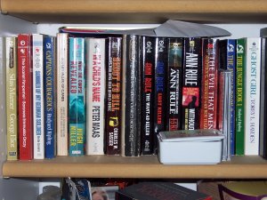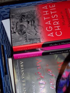 Under my bed in a blue box are the books I have that are waiting to be read. You can see I like mysteries. Underneath these mysteries are my true crime and memoirs. You might even find a romance or two, although I don’t usually read them. I sometimes get them as a free book with an order of books. This isn’t the only place I have stashed books though. Follow me,