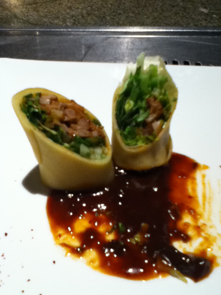Located in SoHo, Woo Lae Oak is a long skinny place, the kitchen does not go on for a mile, but it does take up the left half of the room. On the right there are seats set into the wall and table with a grill, so food can be cooked at your table. Minimal decoration very distinguished looking place. Cloth napkins with dark chop sticks. Fork and spoon were provided on request. We started with an appetizer, O Ree Mari (wrapped cut rolls) pictured here, the dark on the plate is plum sauce, very tasty.