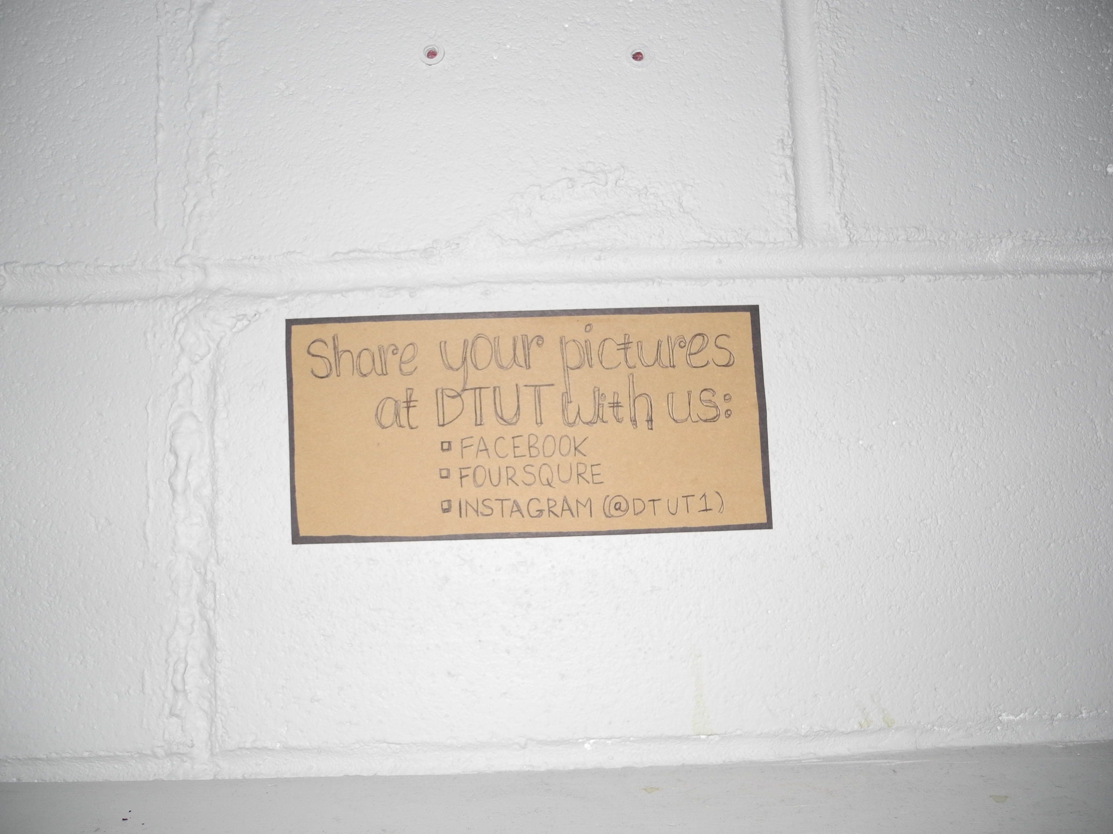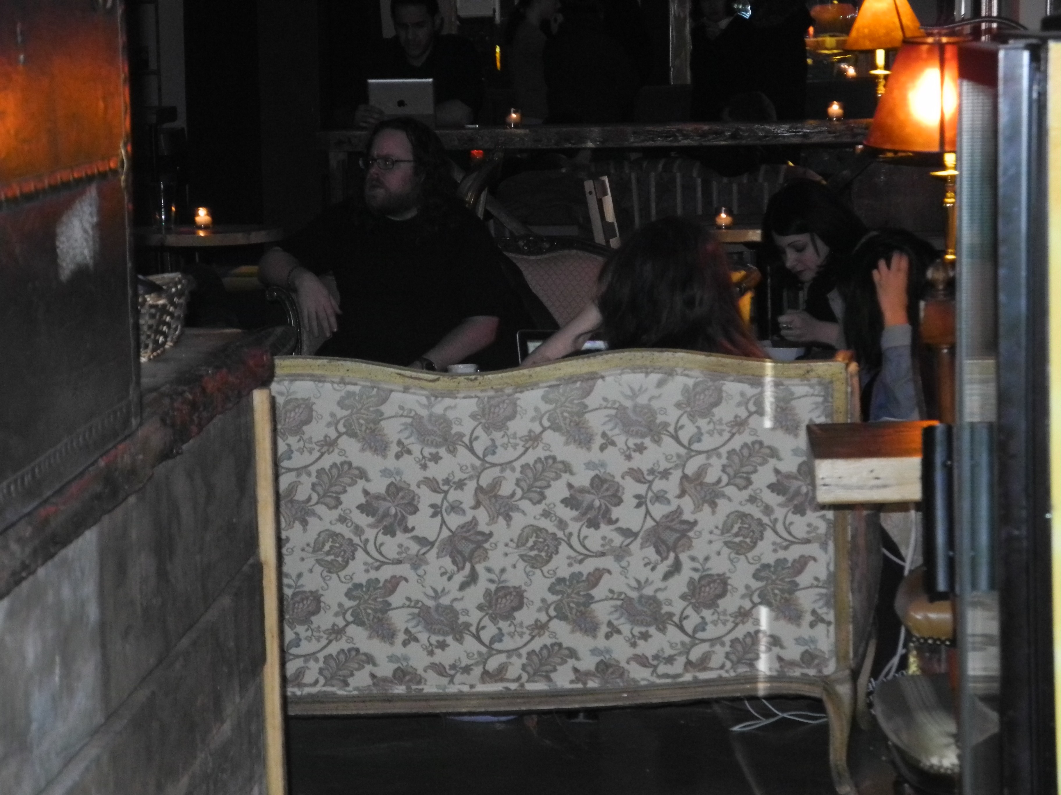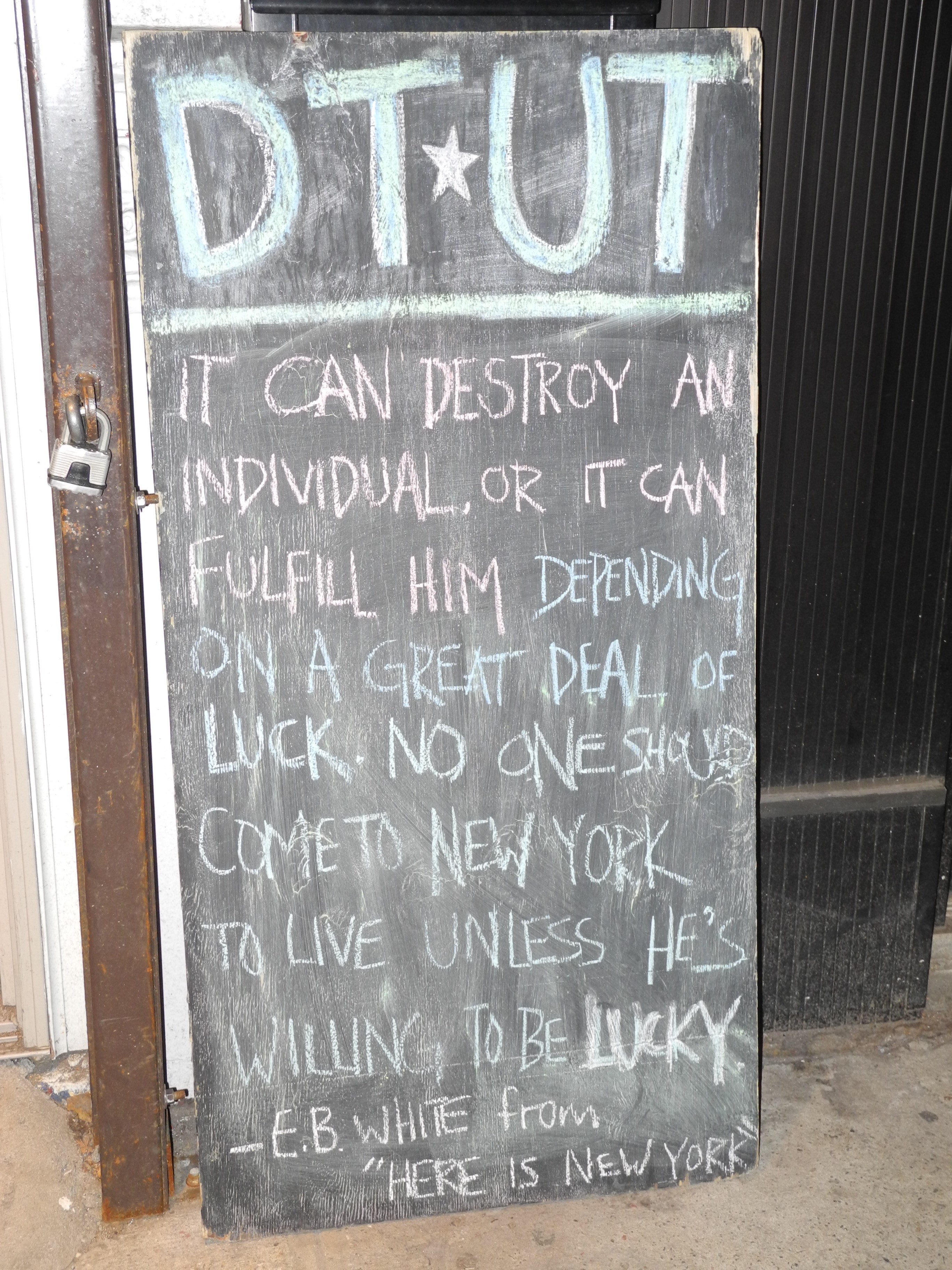 A funny thing happened on the way home from the bar, I found another bar. This sign caught my eye and so I opened the door and entered DTUT. It doesn’t look like a bar, it looks like a coffee shop. Not one of those “chain” coffee shops, you can probably guess who I’m referring to, their name begins with an ‘S’. Rather it resembles an independent coffee shop with couches and low tables, a bar against the wall with wooden and metal bar stools, mismatched chairs and tables. Pop art posters, posters with kooky sayings “I dream of a world where chickens can cross the road without having their motives questioned.”, a giant flag and bookshelves with what looks like real books.