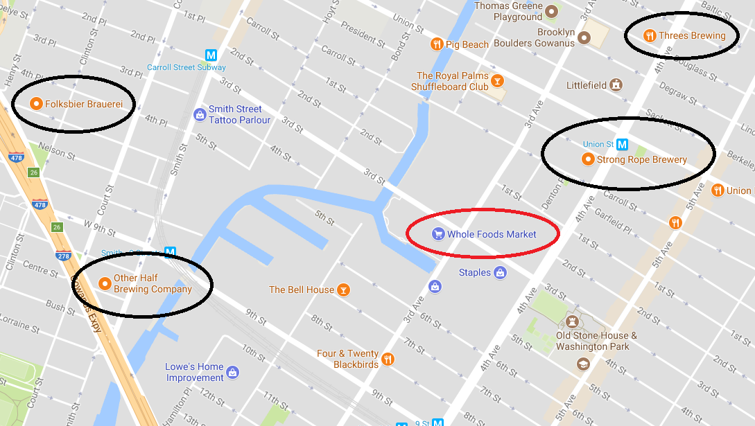 In Brooklyn, Other Half, Folksbier, Three’s Brewing and Strong Rope are in two neighborhoods that touch, (see map). Also you can see Whole Foods Market, which is where my knitting group meets. On this particular night, the brewery after knitting was Strong Rope. I planned it this way because Strong Rope is closest to the subway train I need to go home. Also on this night they had live music, which I didn’t know before I showed up and per the bartender is not a planned thing. People just show up with their guitars.